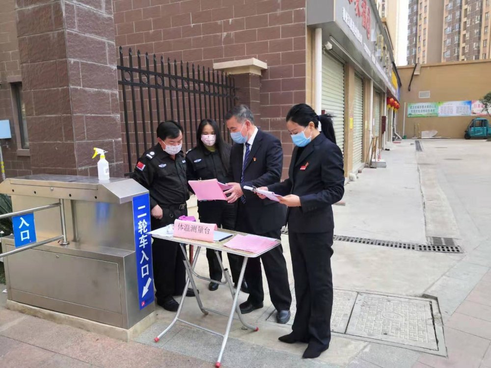 第一黨支部預備黨員,副董事長陽敏在陽光金色春城小區對進出人員進行體溫測量