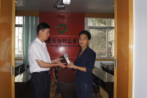2012年5月5日晚8時,江西燕興物業管理公司贛州中央城市公園物業服務中心秩序維護員王建德同志在公園例行巡查時,有一個游客撿到一個錢包交給了他,希望他能交給丟包... 2012-05-10