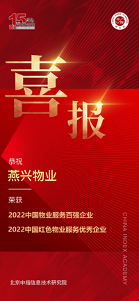 喜報燕興物業(yè)榮獲中國物業(yè)服務(wù)百強企業(yè)TOP482022中國紅色物業(yè)服務(wù)優(yōu)秀企業(yè)特此喜報,再創(chuàng)佳績2022年4月26日,由北京中指信息技術(shù)研究院主辦,北京中指信息技術(shù)研究院中國房地產(chǎn)TOP10研究組、中國... 2022-04-27